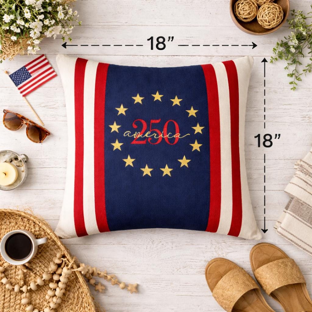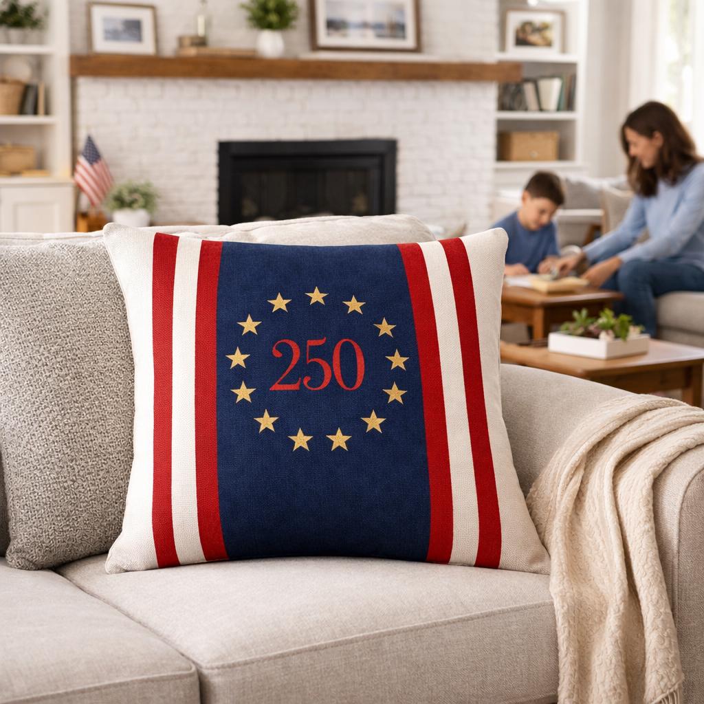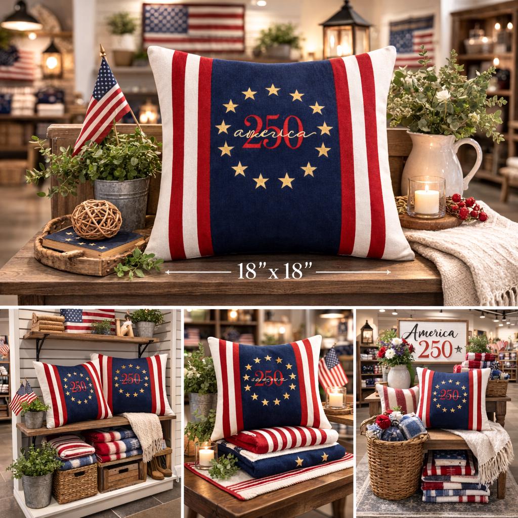 Celebrate America's 250th birthday with a timeless heirloom pillow featuring a Betsy Ross circle, bold navy panel and classic red and cream stripes.
