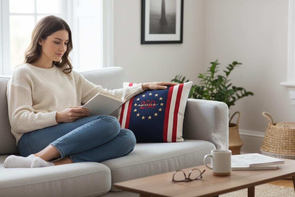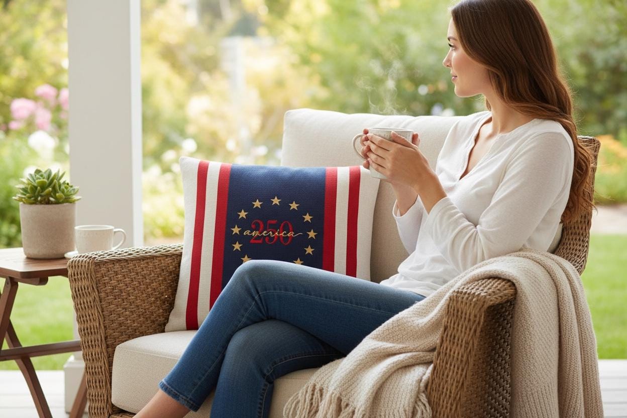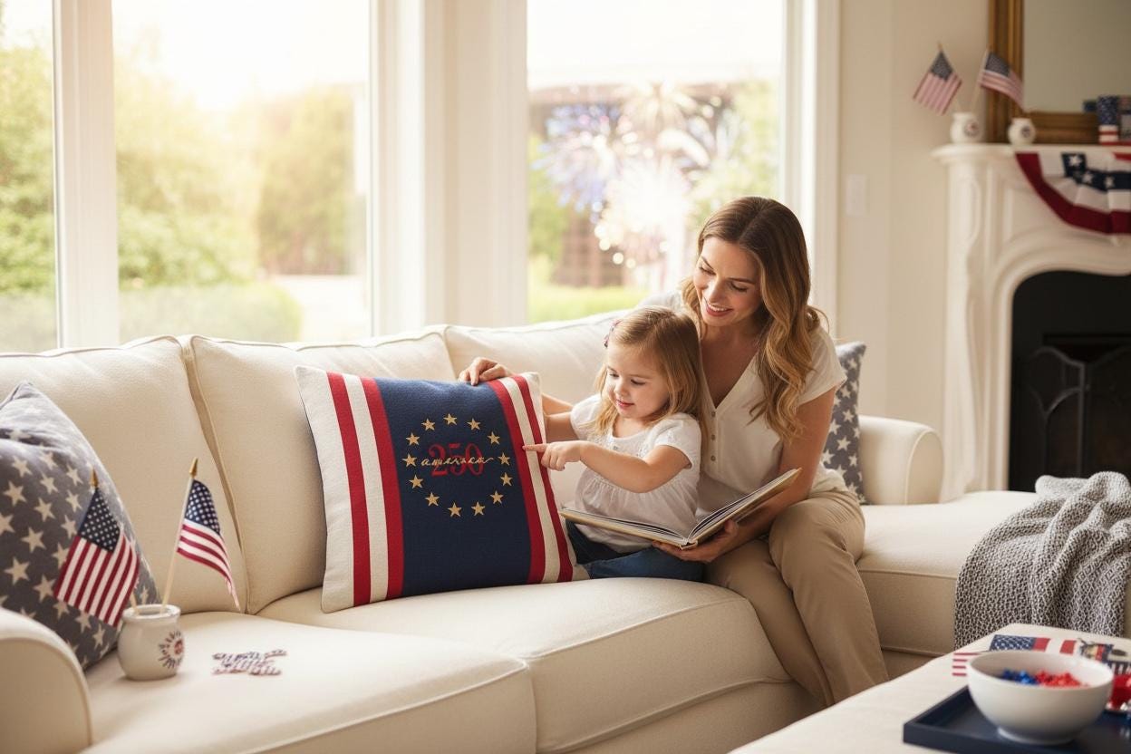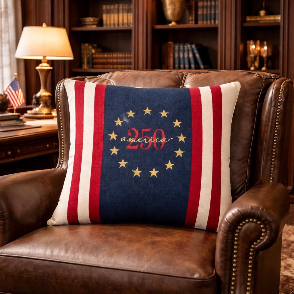 Celebrate America's 250th birthday with a timeless heirloom pillow featuring a Betsy Ross circle, bold navy panel and classic red and cream stripes.