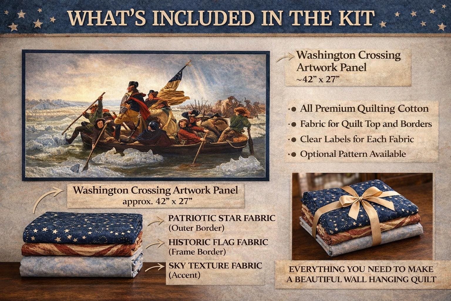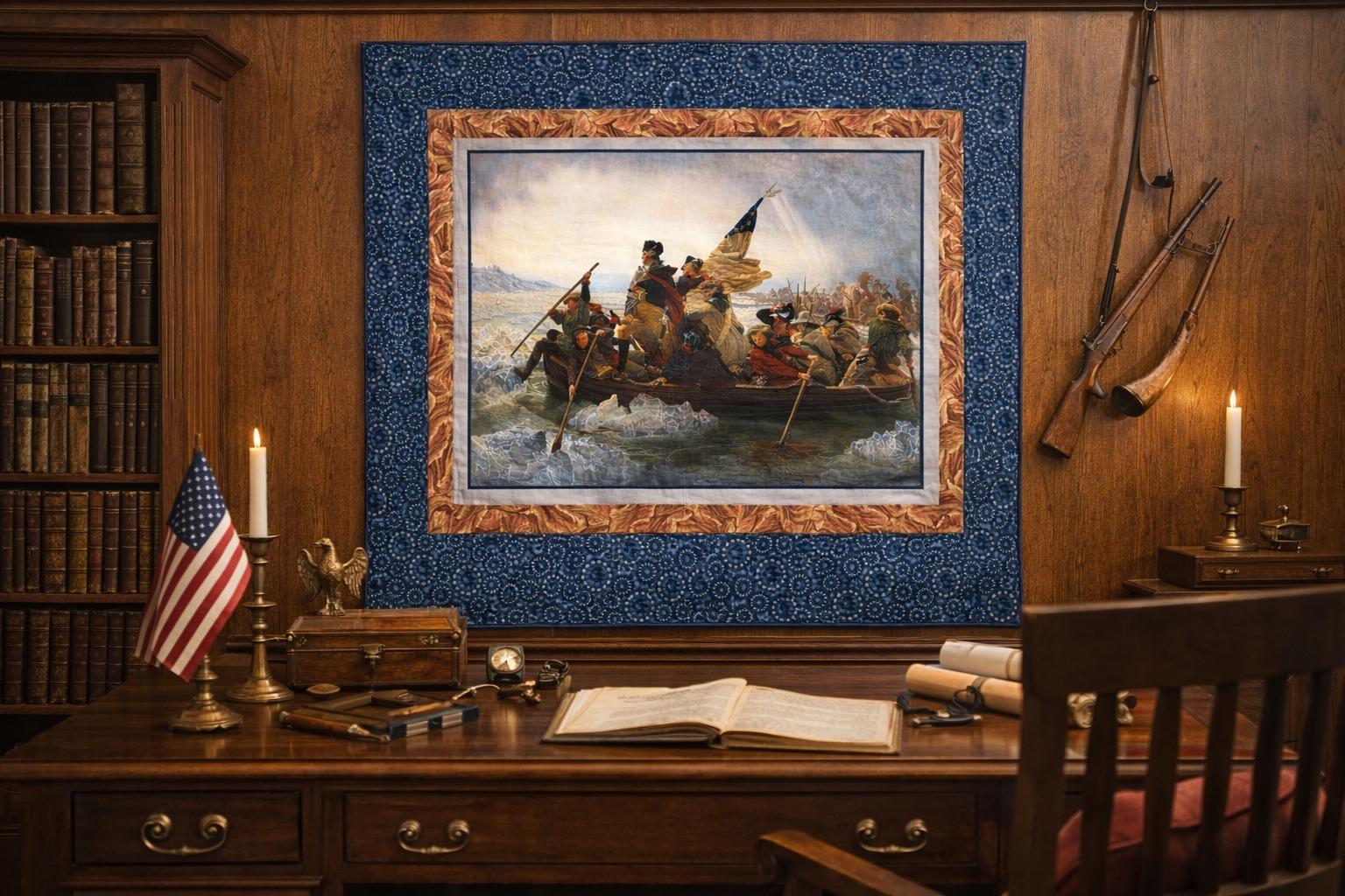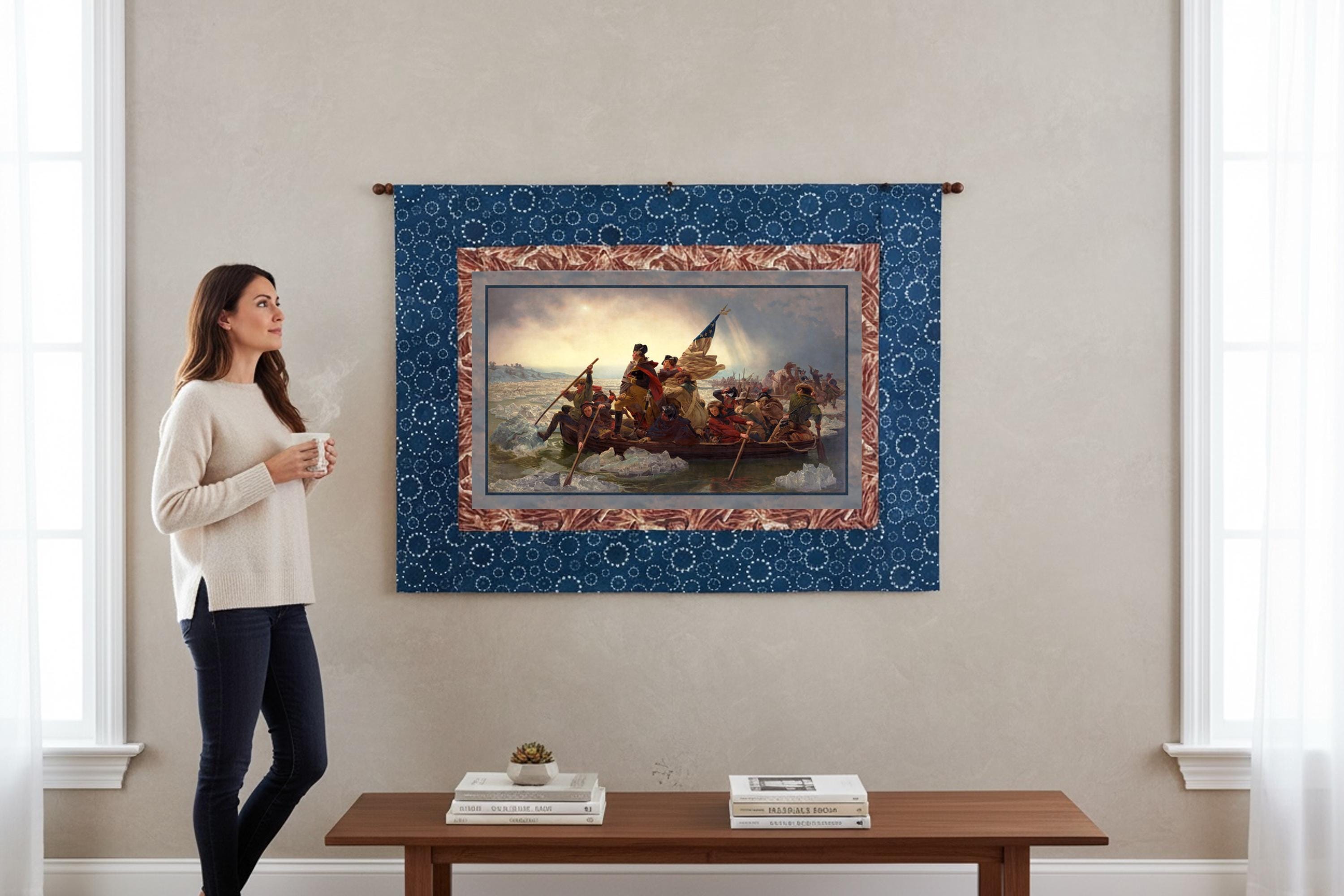 Create a striking piece of Americana heritage decor with the Washington Crossing the Delaware quilt or wall hanging kit. Featuring a historic panel inspired by the iconic Revolutionary war painting, this project combines timeless patriotic imagery with classic quilting fabrics.
