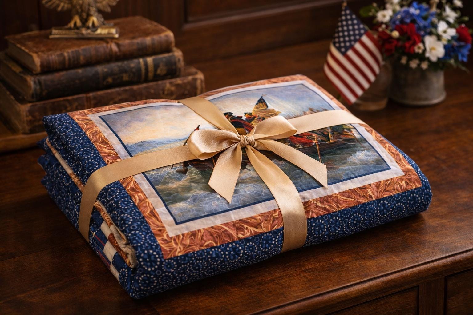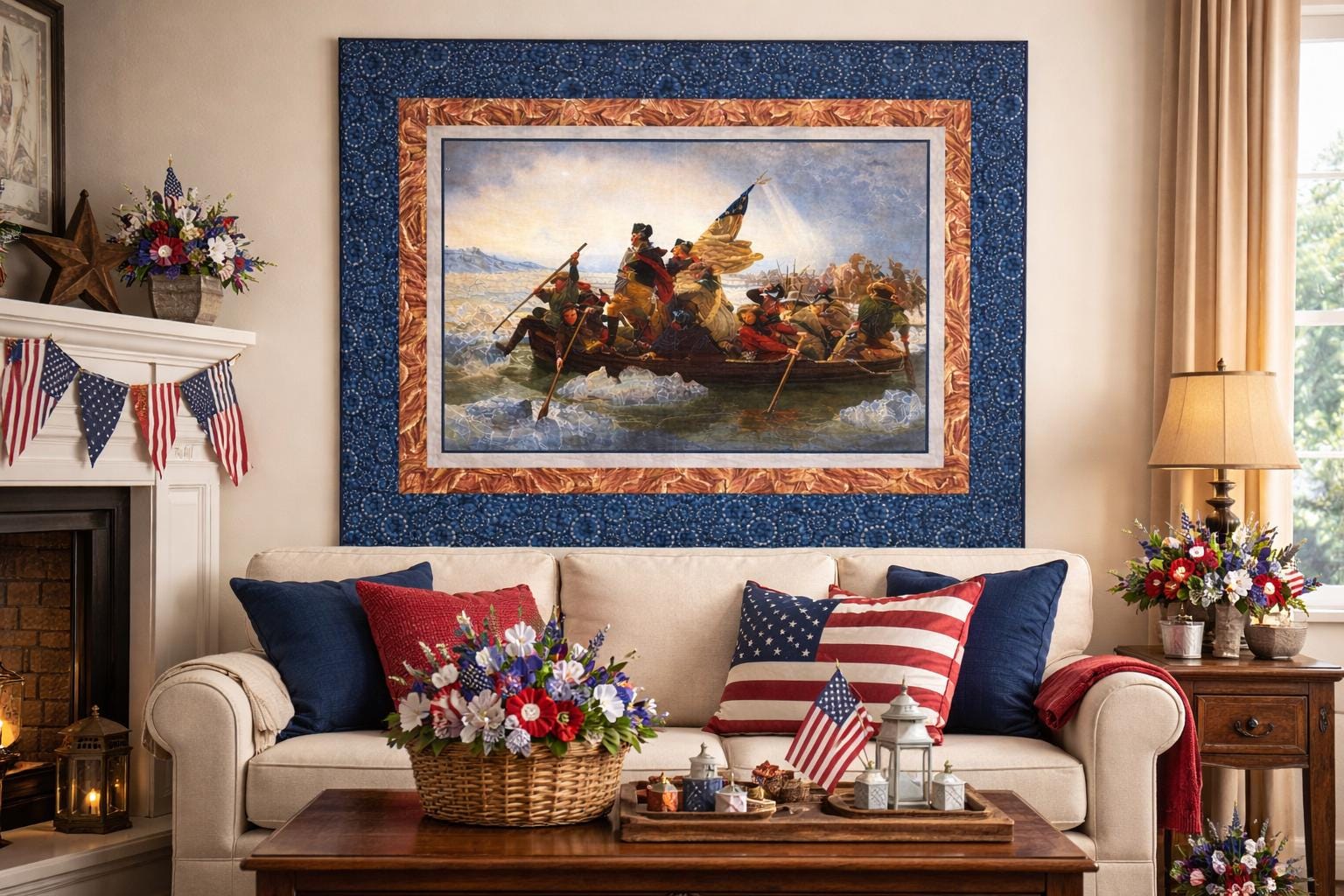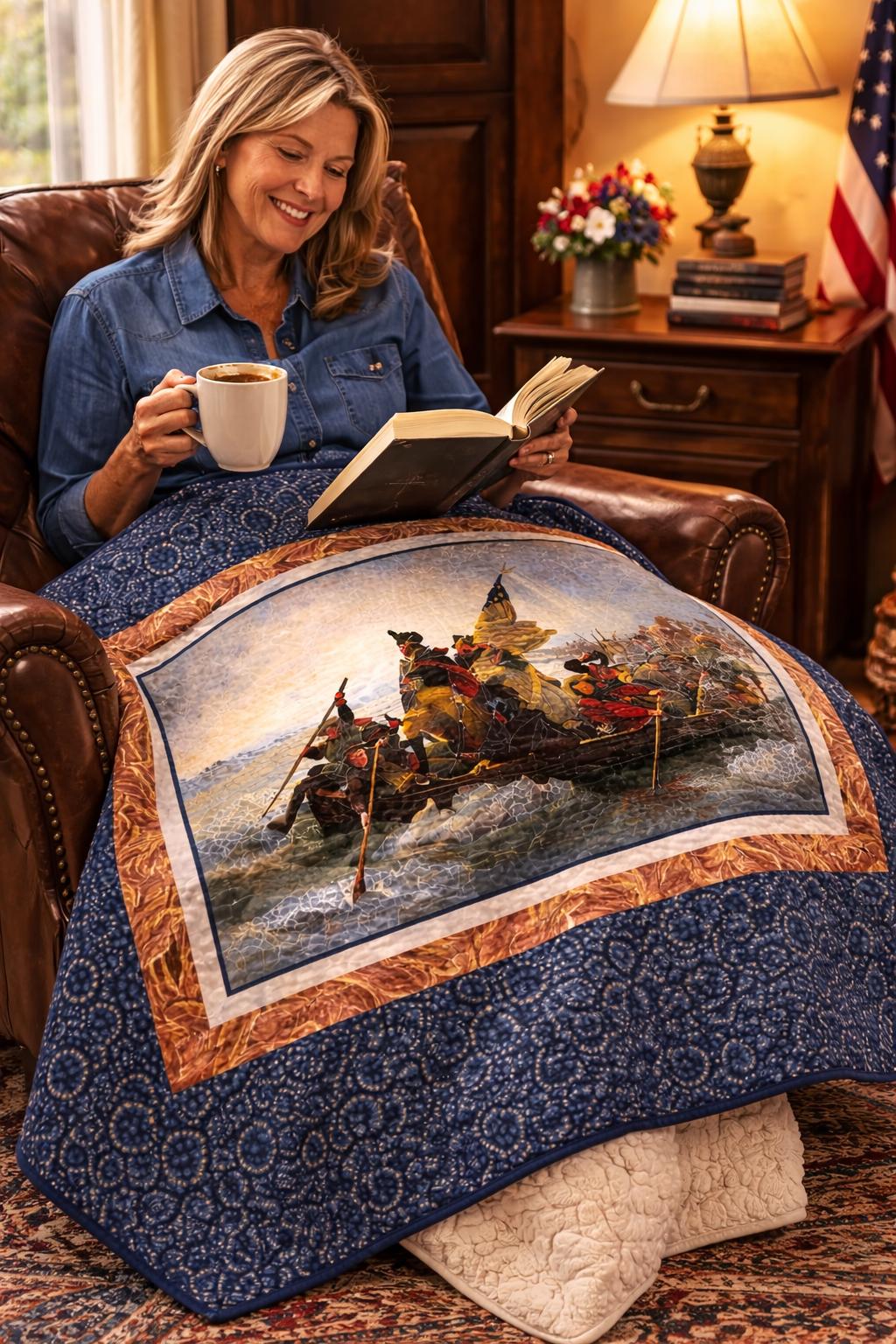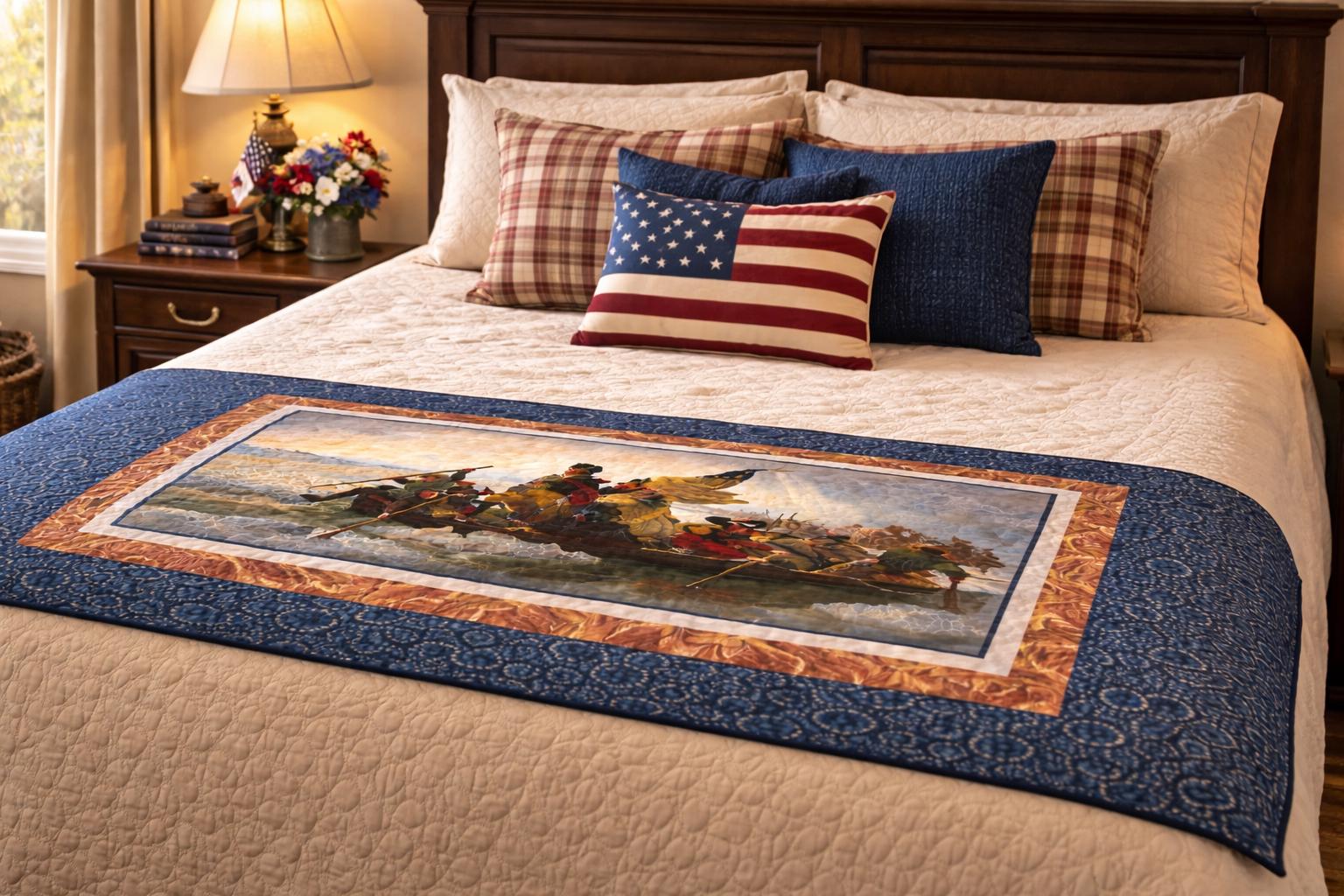 Create a striking piece of Americana heritage decor with the Washington Crossing the Delaware quilt or wall hanging kit. Featuring a historic panel inspired by the iconic Revolutionary war painting, this project combines timeless patriotic imagery with classic quilting fabrics.