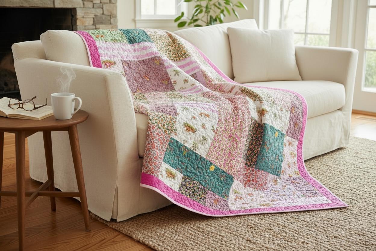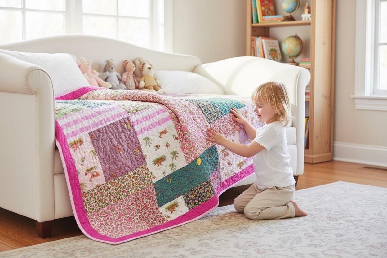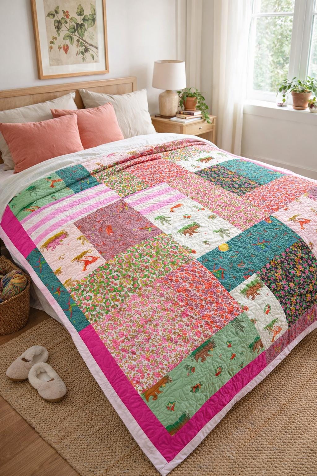 A cheerful handmade patchwork quilt 54 x 54 featuring whimsical woodland prints, florals and soft pink striped accents, all framed with a soft pink border. This one- of a kind quilt brings cottagecore charm and storybook warmth to a nursery, child's room or cozy guest space.