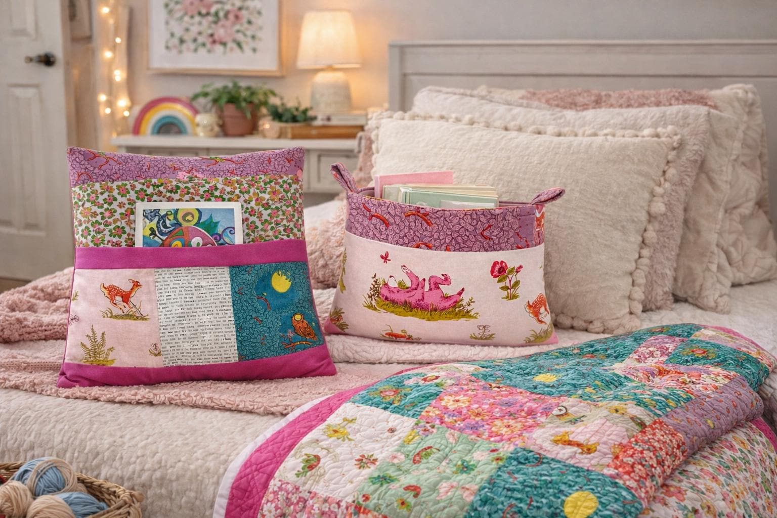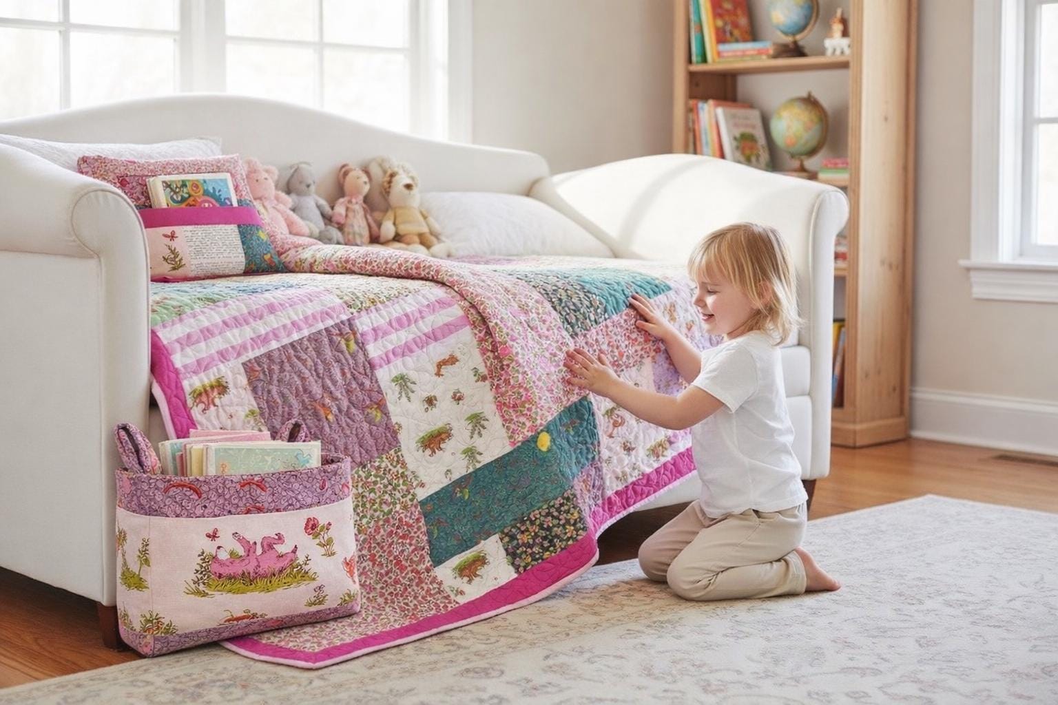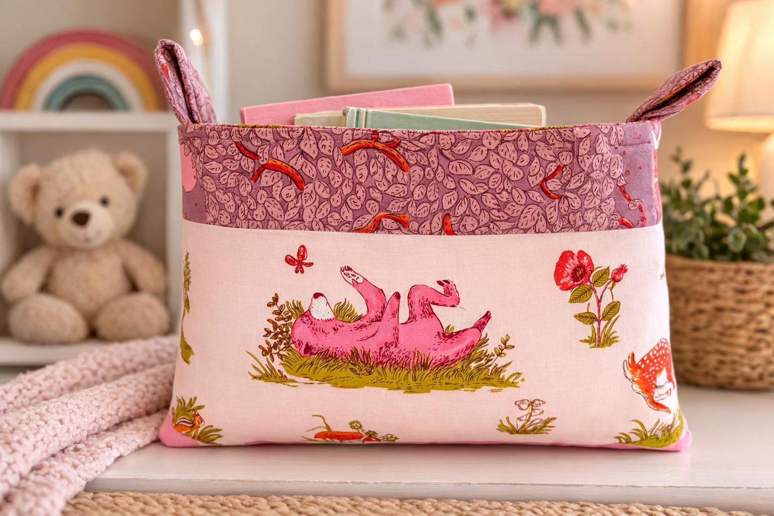 A matching book pillow and storage basket completes this one-of-a kind set.