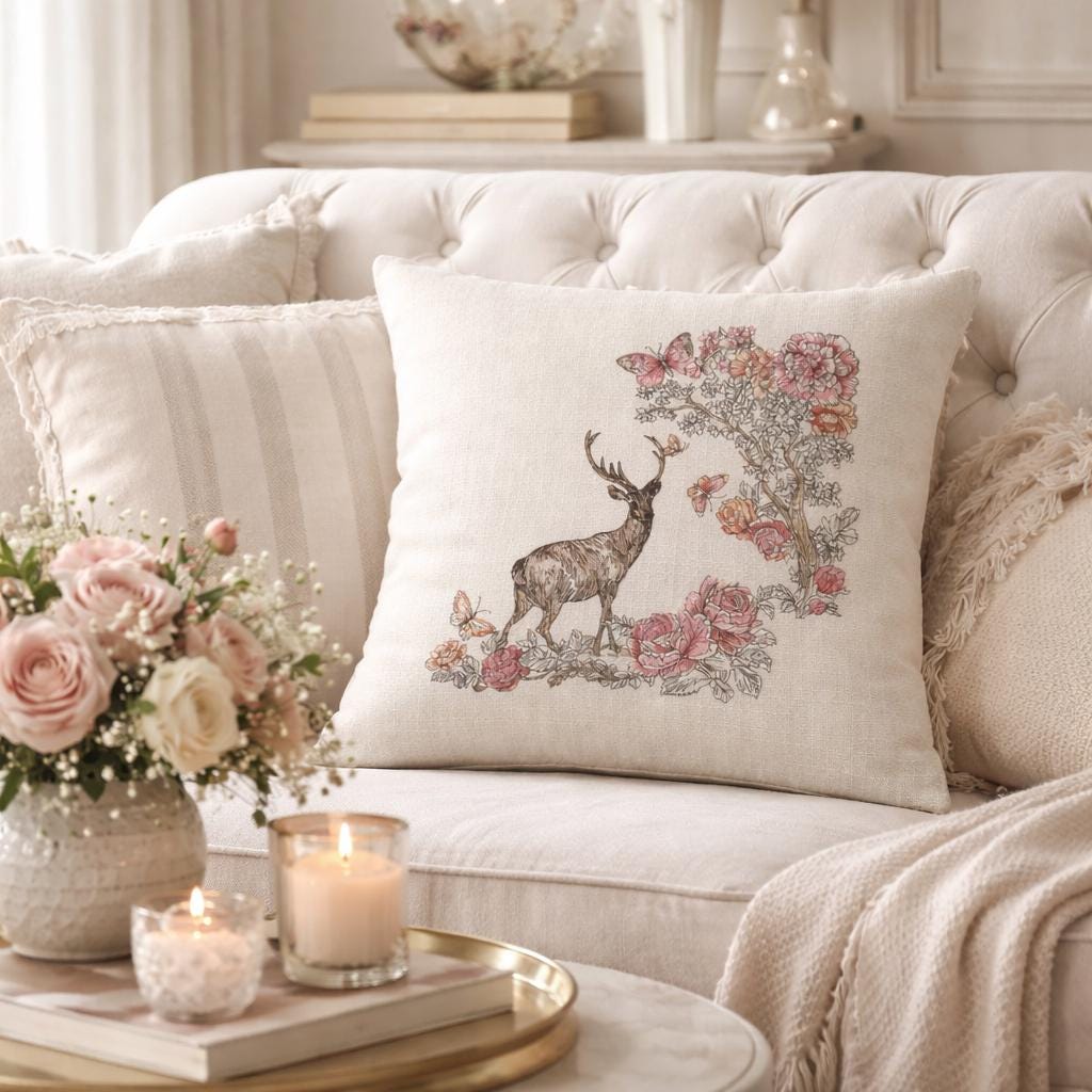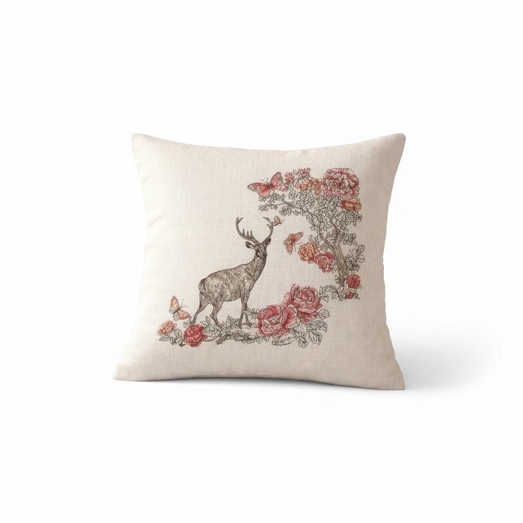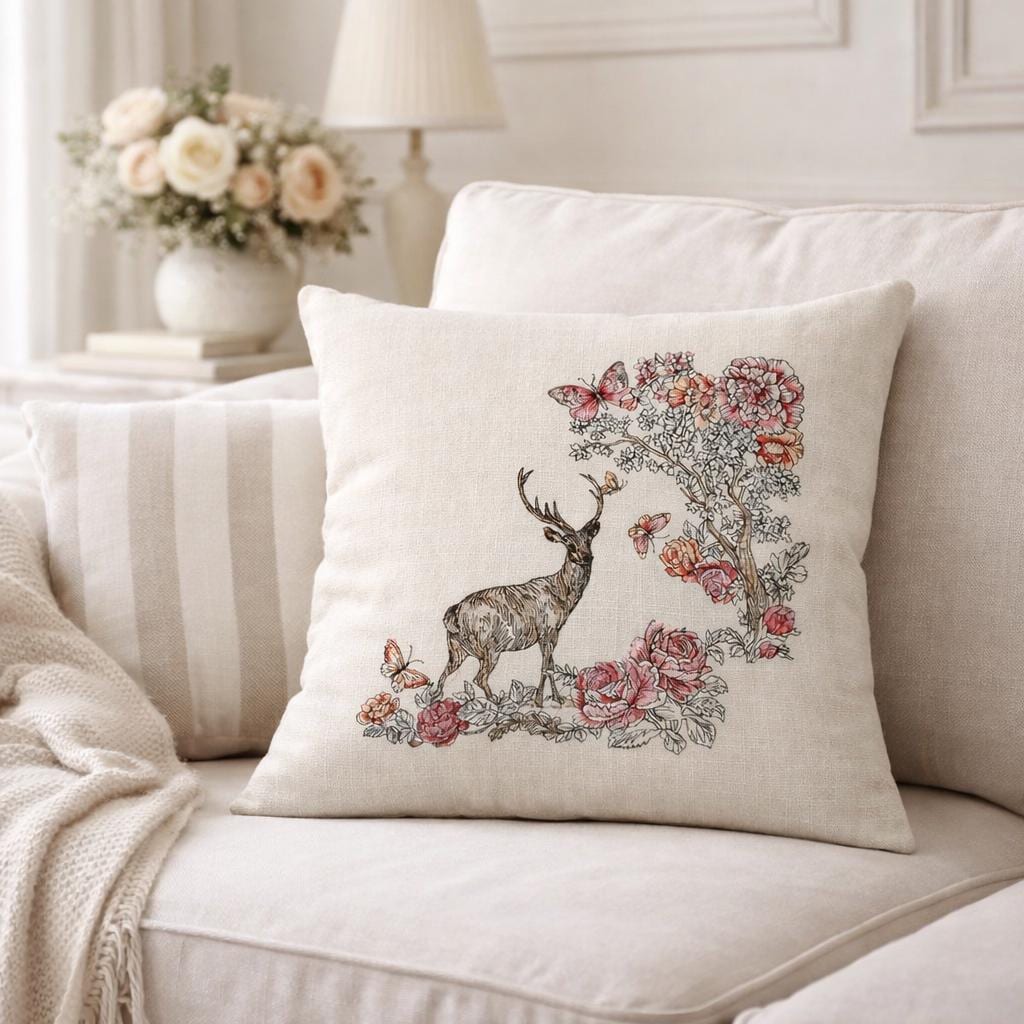 Bring soft woodland charm to your home with this beautiful embroidered floral deer pillow. Featuring a graceful deer surrounded by blooming florals and delicate butterflies, this design blends rustic elegance with cozy cottage style. The neutral background makes it easy to style in entryways, bedrooms, living rooms, reading nooks or seasonal displays.