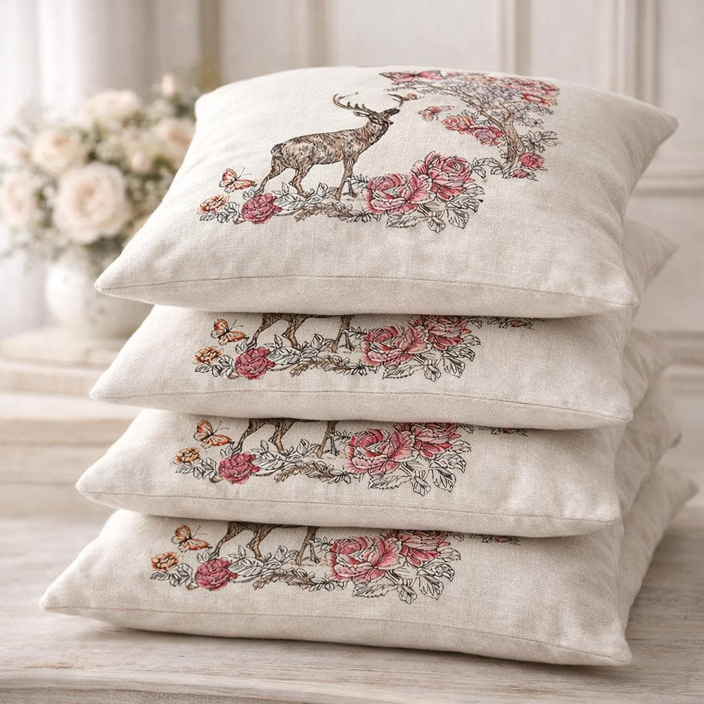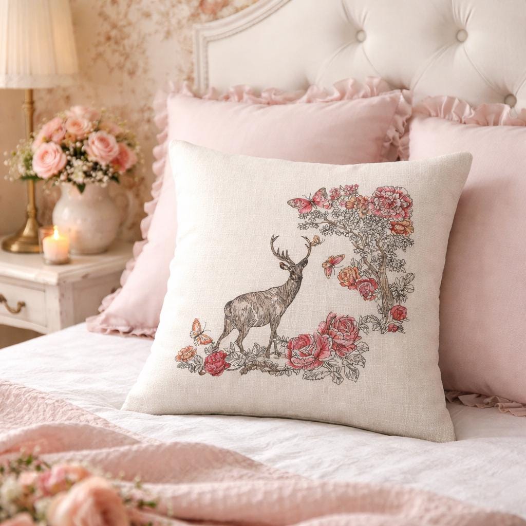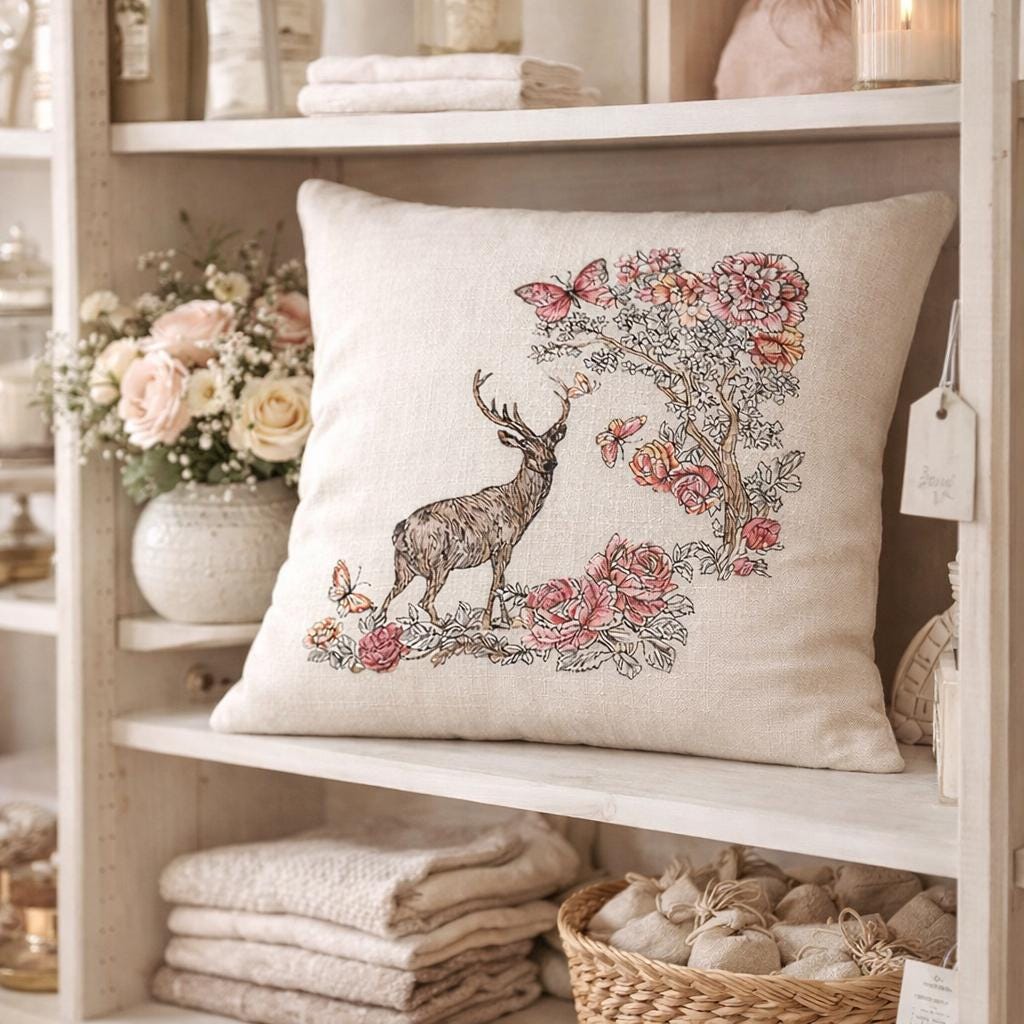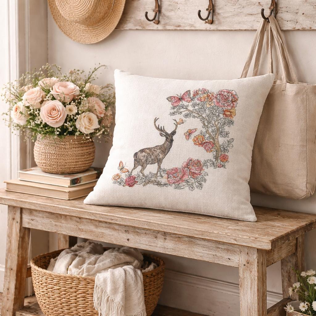 Bring soft woodland charm to your home with this beautiful embroidered floral deer pillow. Featuring a graceful deer surrounded by blooming florals and delicate butterflies, this design blends rustic elegance with cozy cottage style. The neutral background makes it easy to style in entryways, bedrooms, living rooms, reading nooks or seasonal displays.
