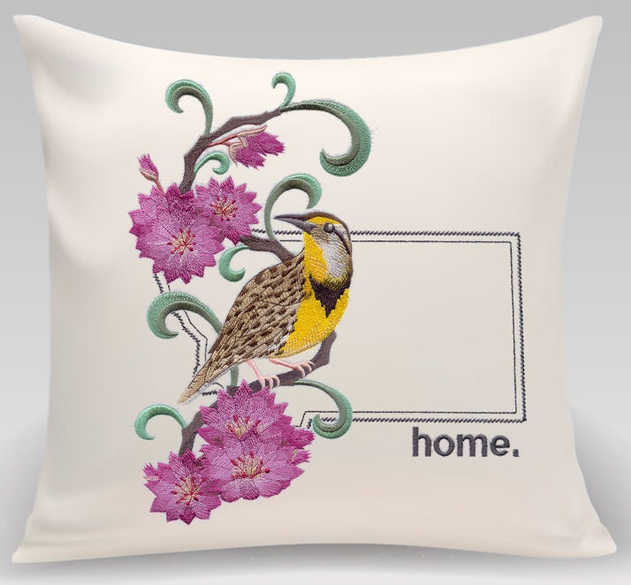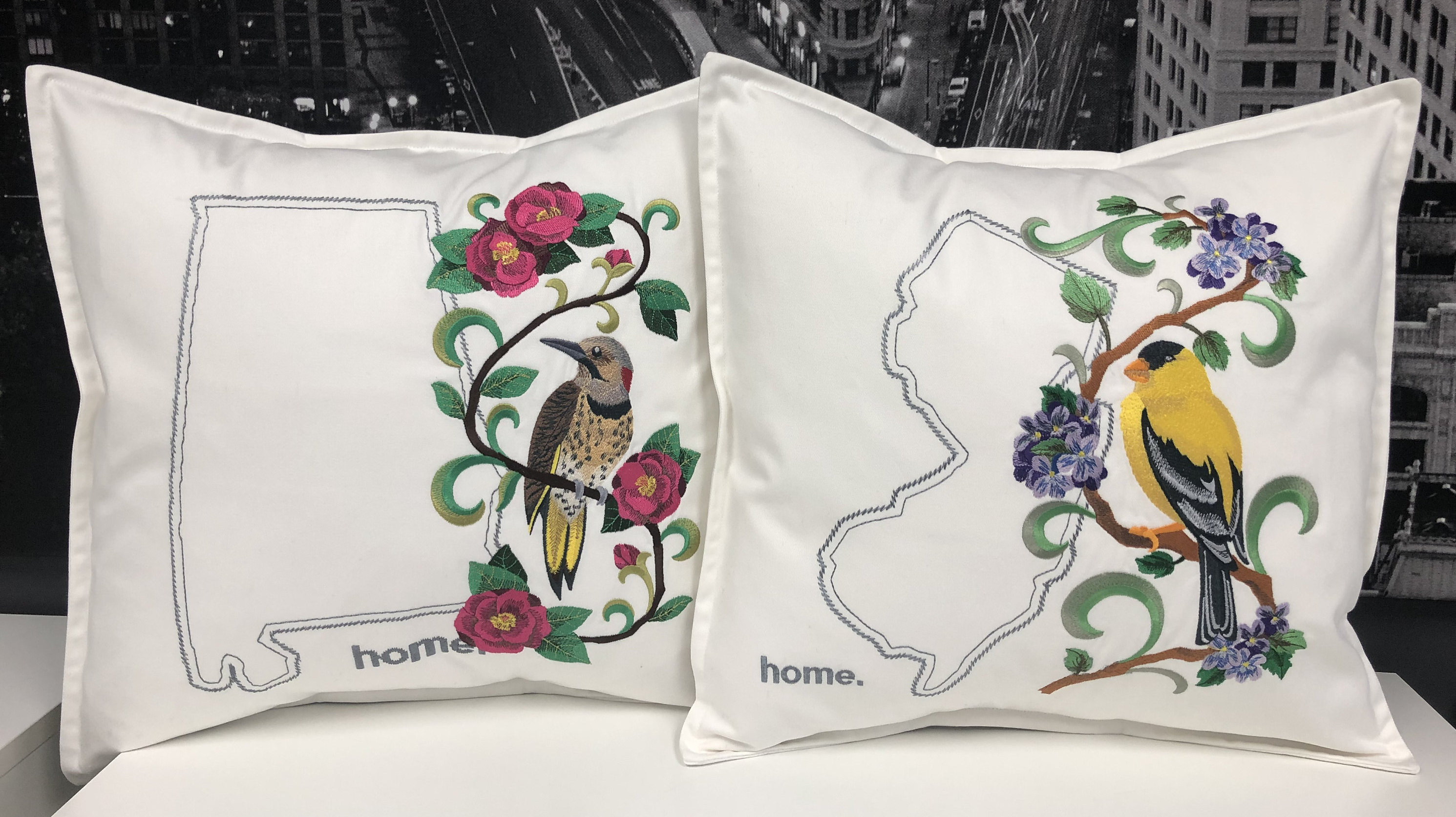 Pillows are embroidered and handmade using direct embroidery. The neutral background makes a perfect addition to any space and the vivid color in the embroidery creates a beautiful effect. The state outline is embroidered with the word home.