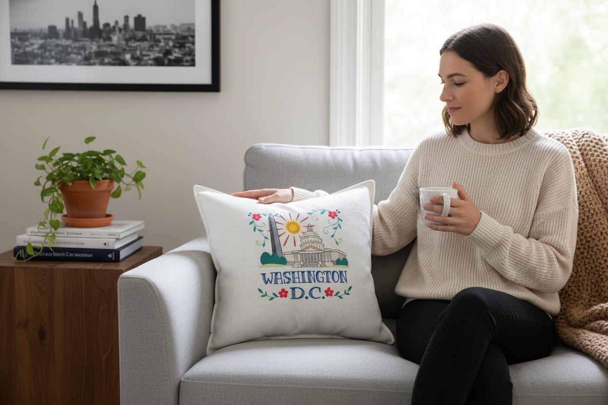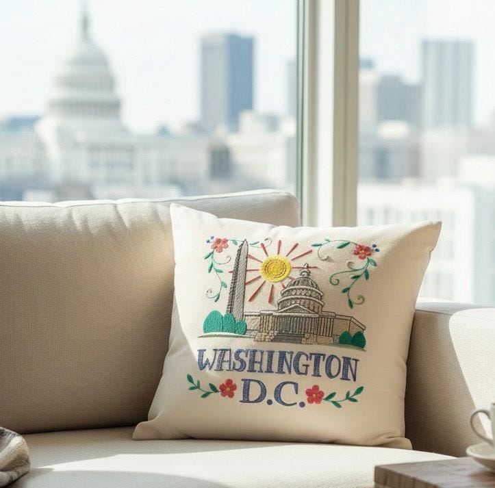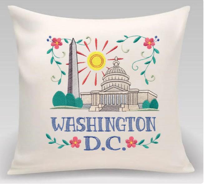 Celebrate the charm and history of Washington, D.C. with this beautifully embroidered decorative throw pillow. Featuring the U.S. Capital, Washington Monument and a radiant sun framed by delicate florals, this pillow adds a refined yet cheerful touch to any space.