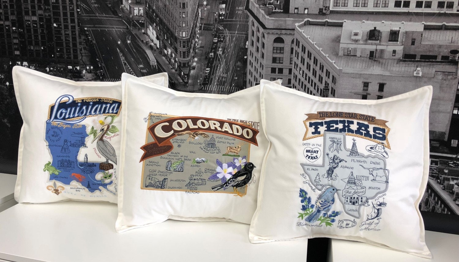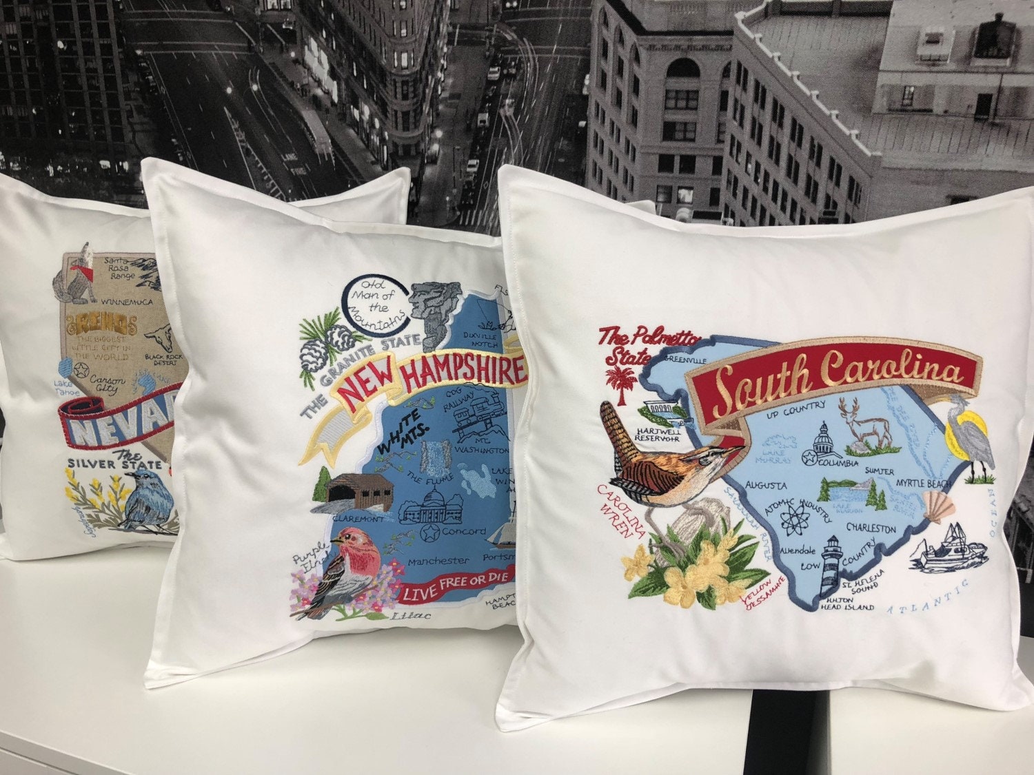 Pillows are embroidered and handmade using direct embroidery and applique techniques. The neutral background makes a perfect addition to any space and the vivid colors in the embroidery along with the applique fabric placed on top of the background fabric in the state creates a beautiful effect.