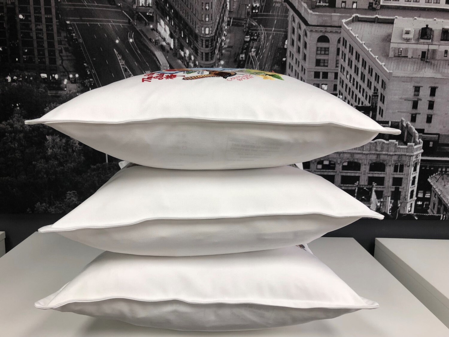 Pillows are embroidered and handmade using direct embroidery and applique techniques. The neutral background makes a perfect addition to any space and the vivid colors in the embroidery along with the applique fabric placed on top of the background fabric in the state creates a beautiful effect.