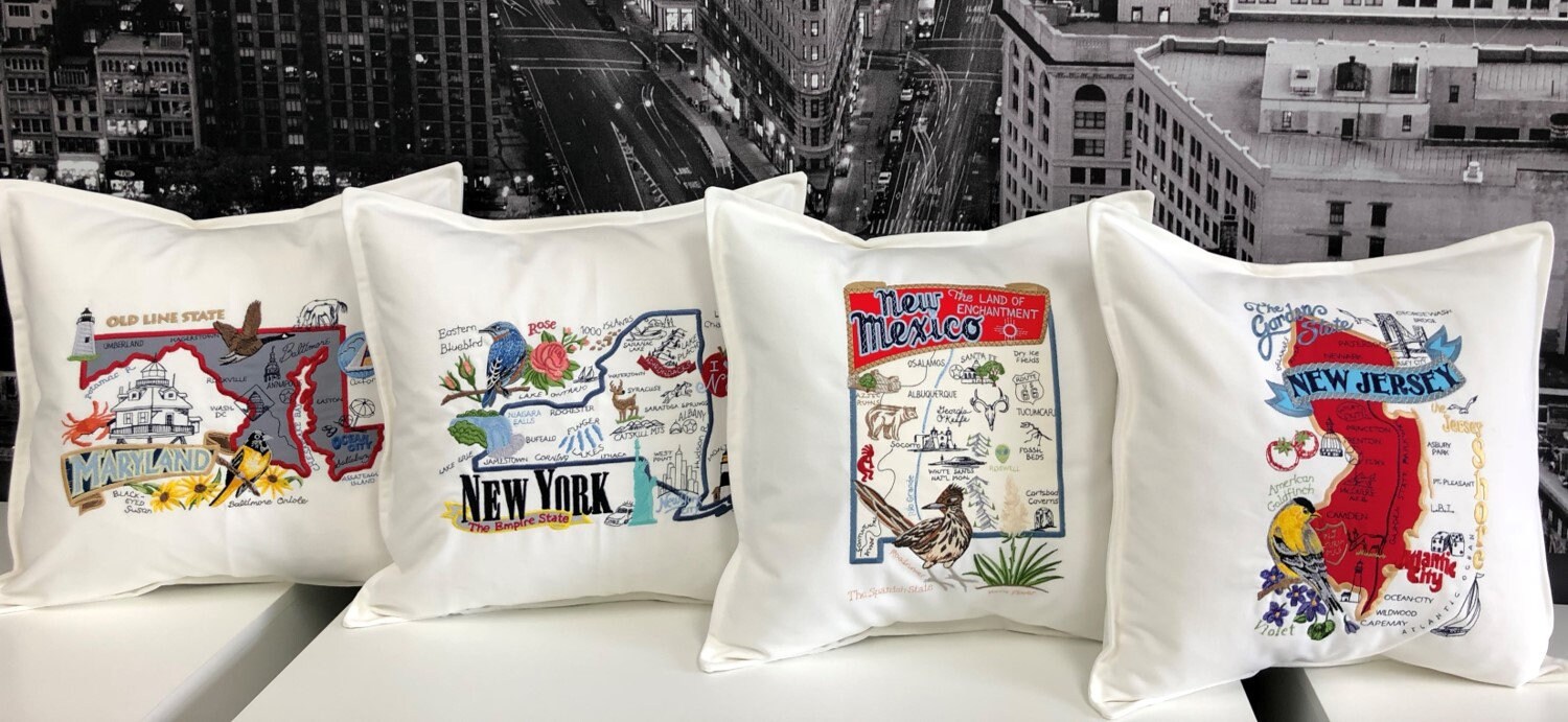 Our pillows are embroidered and handmade in our studio using direct embroidery and applique techniques. The neutral background makes a perfect addition to any space and the vivid colors in the embroidery along with the applique fabric placed on top of the background fabric in the state creates a beautiful effect.