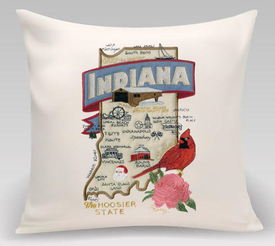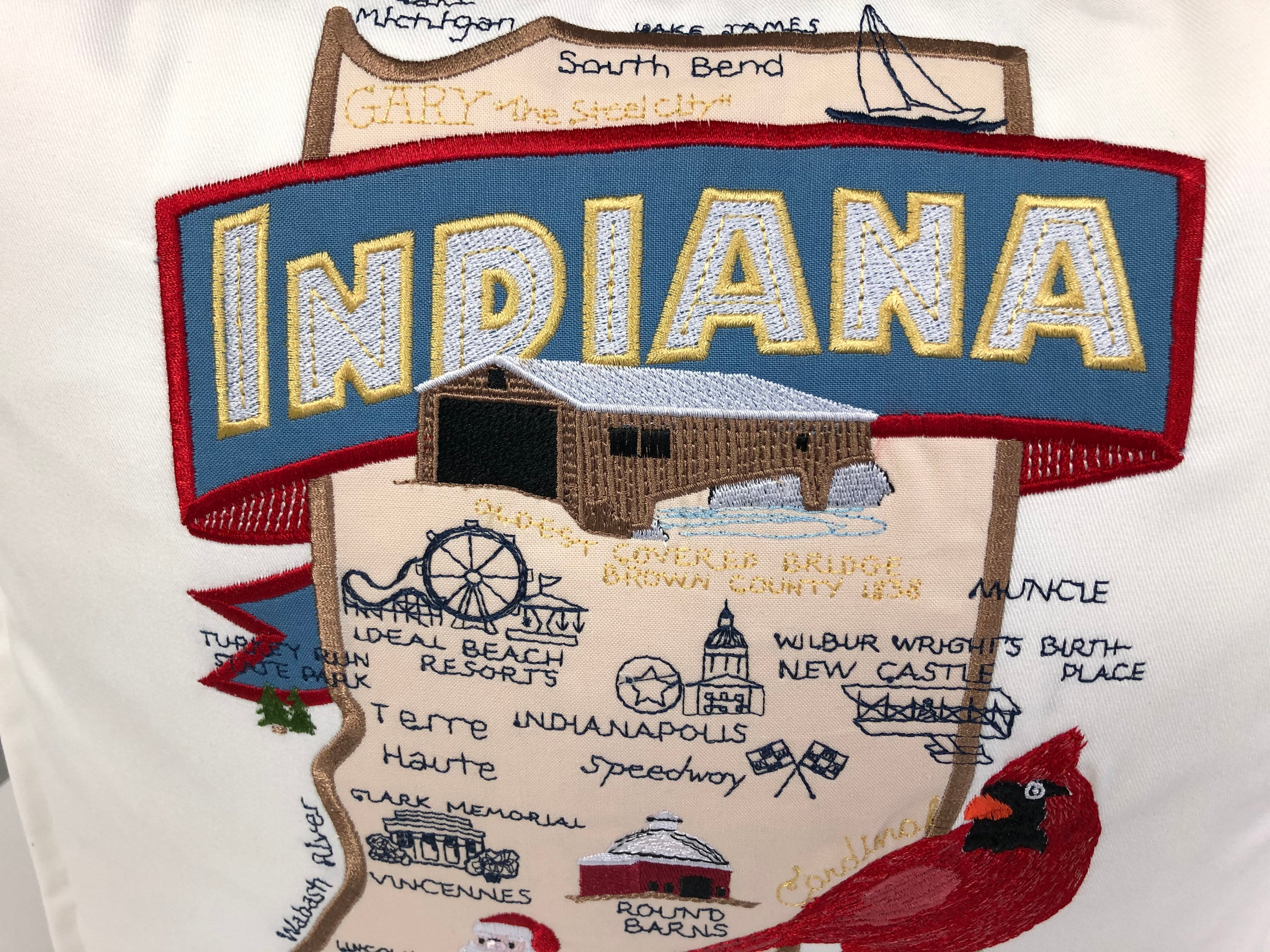 Pillows are embroidered and handmade using direct embroidery and applique techniques. The neutral background makes a perfect addition to any space and the vivid colors in the embroidery along with the applique fabric placed on top of the background fabric in the state creates a beautiful effect.