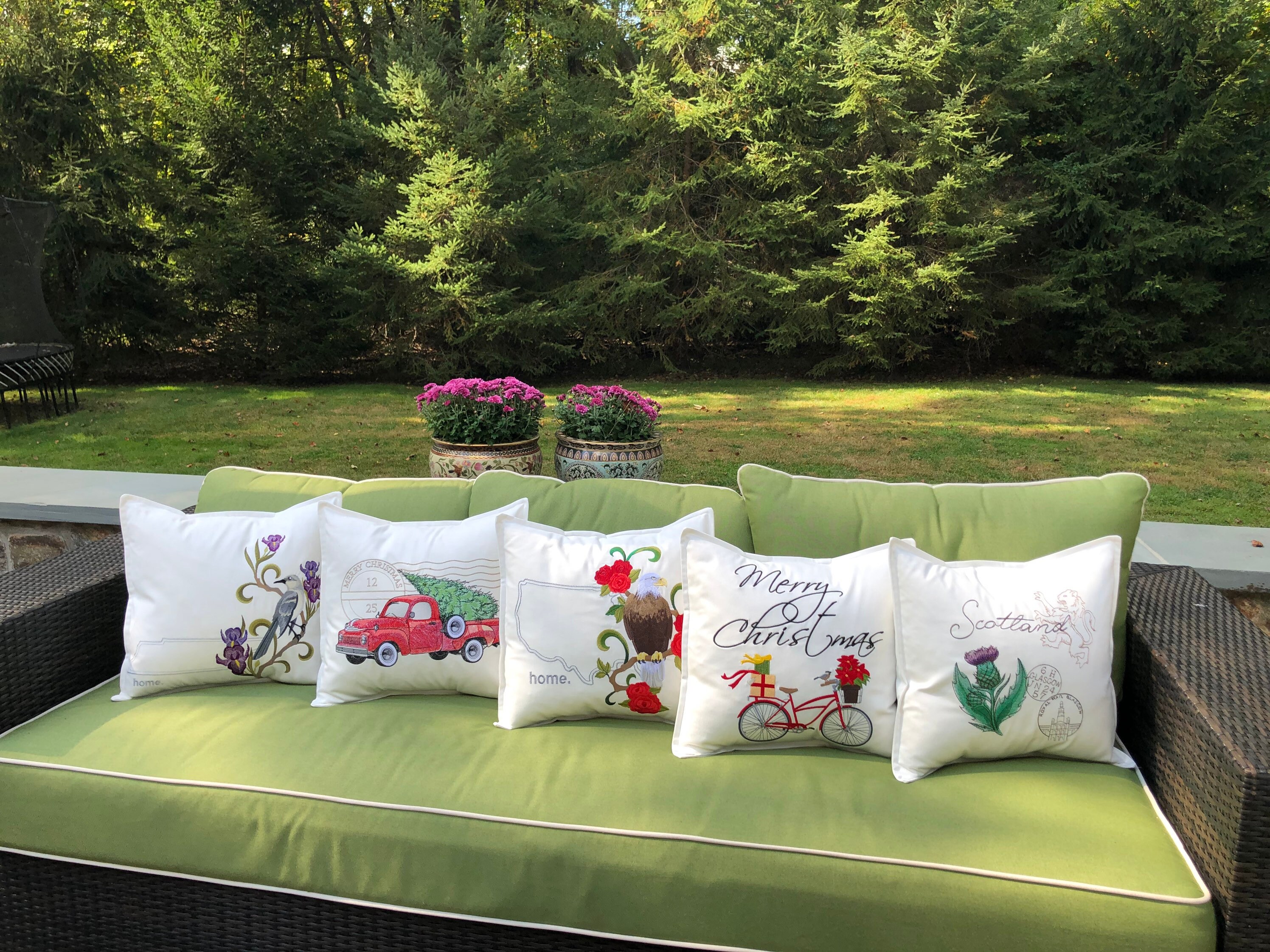 Our pillows are embroidered and handmade in our studio using direct embroidery and applique techniques. The neutral background makes a perfect addition to any space and the vivid colors in the embroidery along with the applique fabric placed on top of the background fabric in the state creates a beautiful effect.