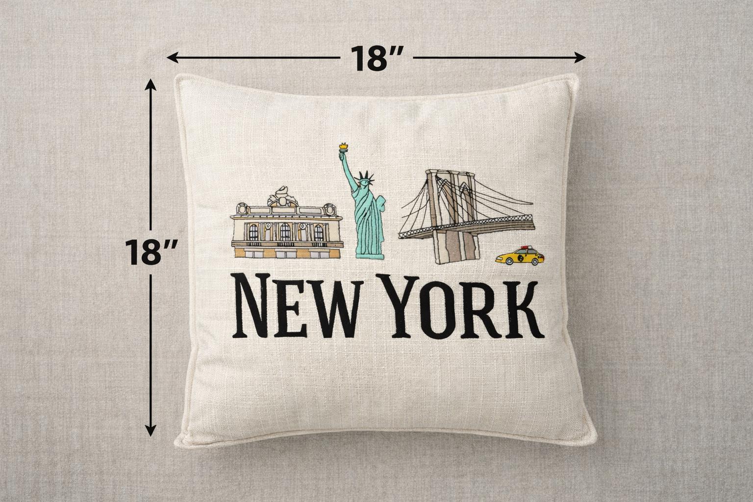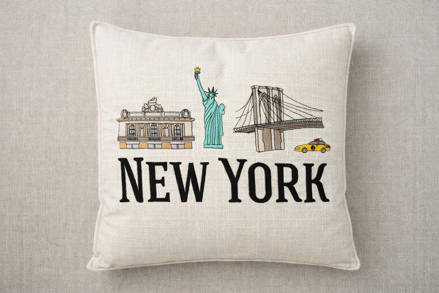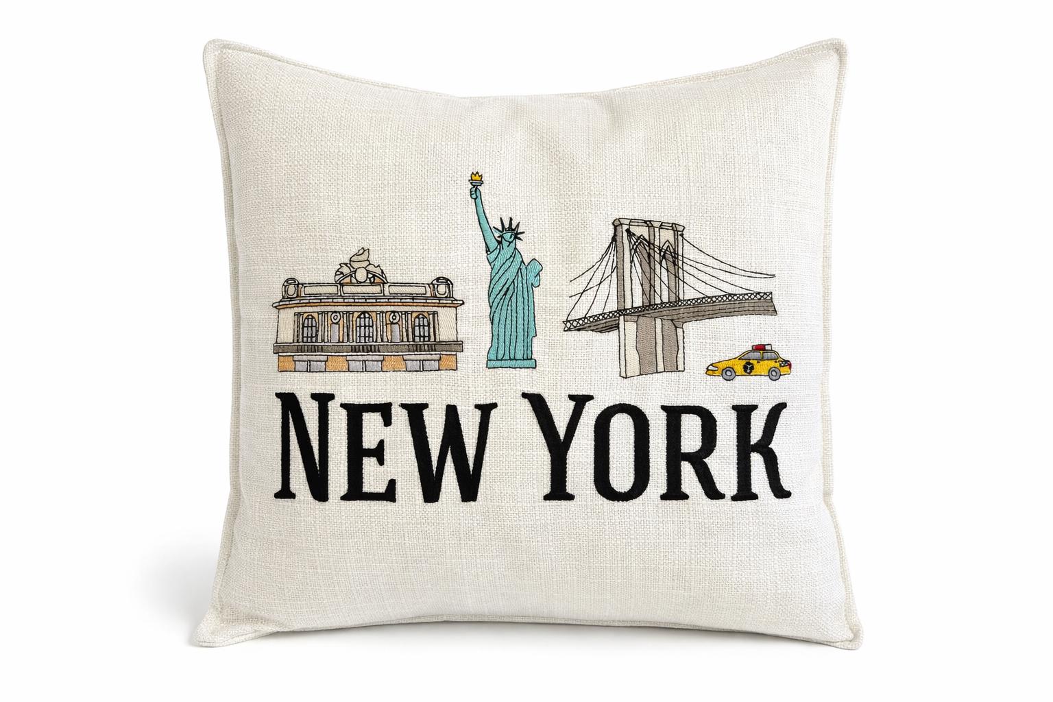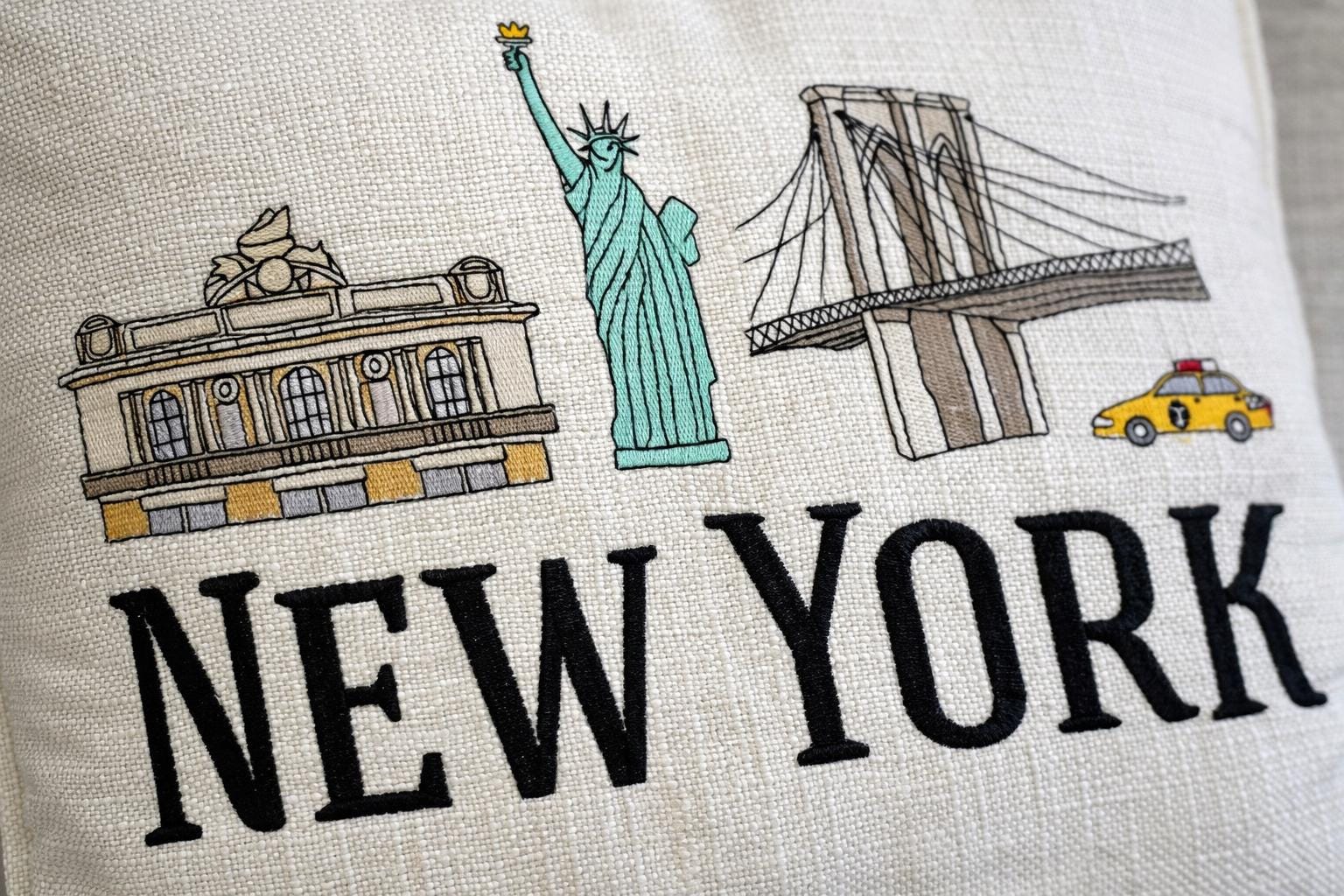 Bring a touch of New York city charm into your home with this beautifully embroidered pillow featuring iconic NYC landmarks including the statue of Liberty, Brooklyn Bridge and Grand Central Terminal paired with bold NEW YORK lettering.