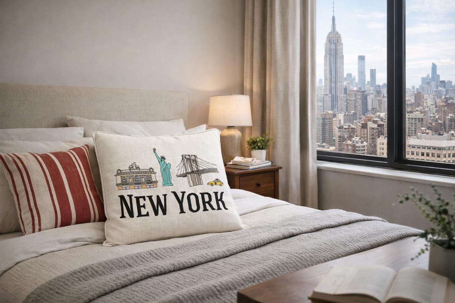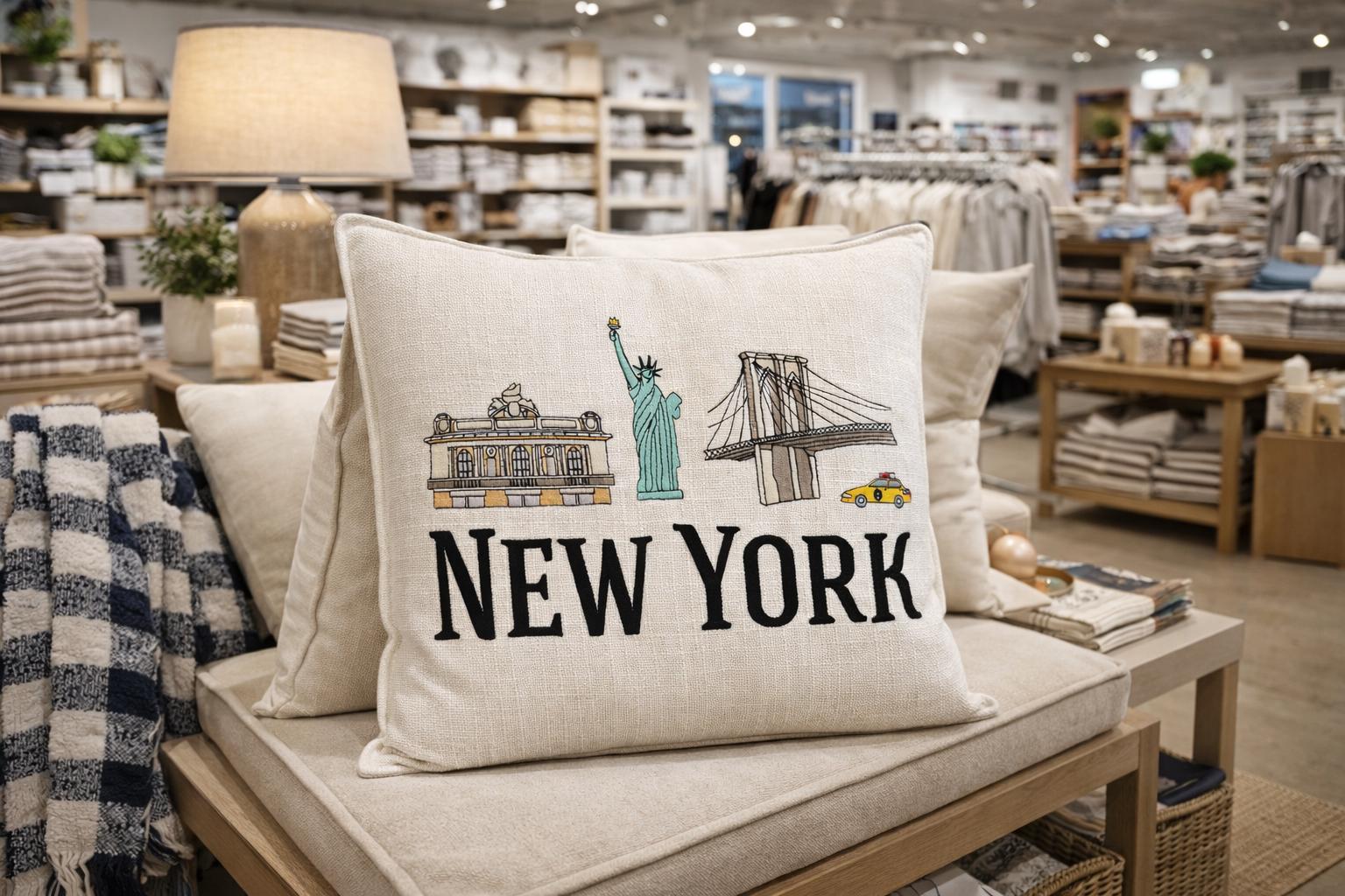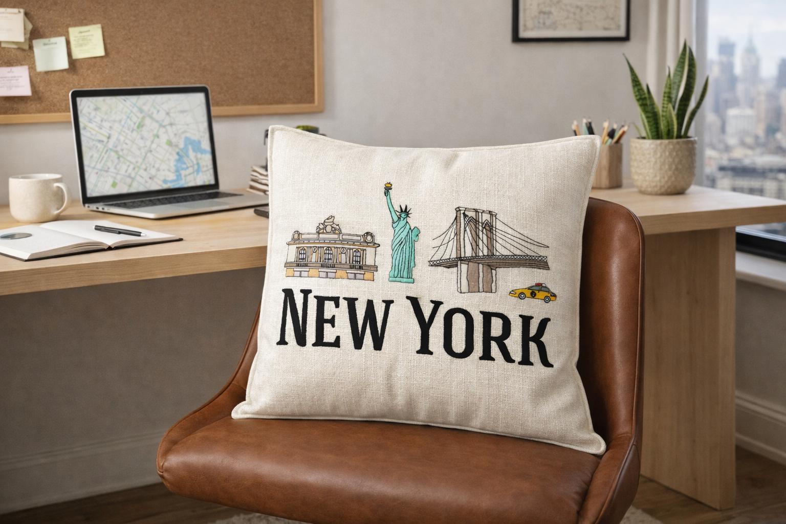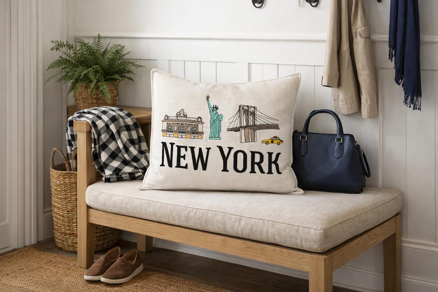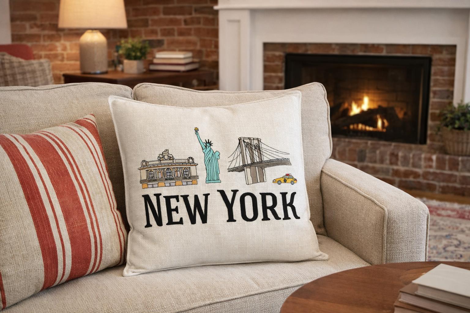 Bring a touch of New York city charm into your home with this beautifully embroidered pillow featuring iconic NYC landmarks including the statue of Liberty, Brooklyn Bridge and Grand Central Terminal paired with bold NEW YORK lettering.